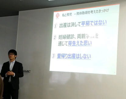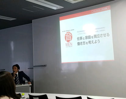 続いて、イクメンプロジェクトより、国が「イクメン」を推進する理由と育児休業制度について説明し、