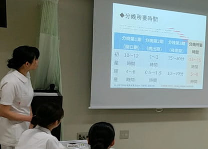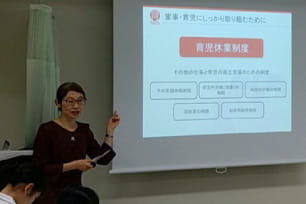 前半では、菱谷講師がお産の際の母性について、夫のお産の際の関わり方について、助産師や看護師の視点からどう夫や家族へ接するべきかについてお話いただきました。