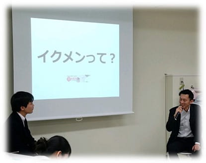 白木教授・鈴木准教授の「イクメン・イクボス・育児休業とは?」という生徒の皆さんへの説明から始まり、前半では、イクメンプロジェクトより詳しく近年の「育児休業」について説明し、国の取り組みをご紹介しました。