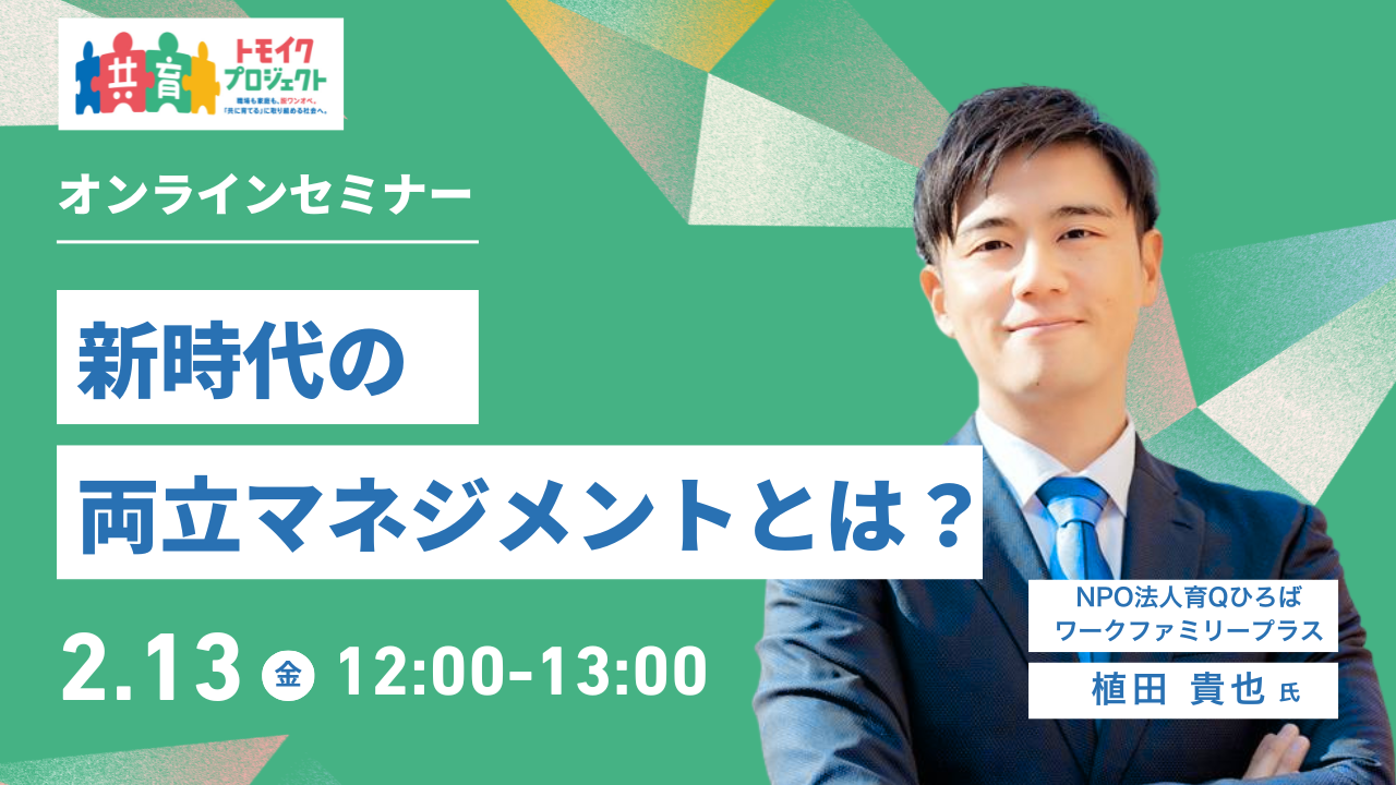 セミナー・イベント 人事・管理職向けセミナー 開催予定のセミナー 2026年2月13日(金) 『新時代の両立マネジメントとは?』 詳細はこちら 2026年2月 『選ばれる企業になるために経営者・人事労務担当者に求められる役割とは』 詳細はこちら 2026年2月 『共育て推進のために管理職に求められる役割とは』 詳細はこちら